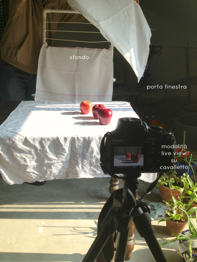 E cosi, quando scatto, in base alla luminosità a disposizione, imposto i valori di ISO-DIAFRAMMA-VELOCITA’, ma tenendo sempre sotto controllo l’istogramma. Infatti, non scatto mai senza verificare l’esposimetro che, per me, deve essere sempre sullo “0” (solo quando ho bisogno di una foto particolarmente luminosa, vado in leggera sovraesposizione, ma non più di +1). Con tanta luce, è possibile scattare con velocità di otturatore altissima (per la massima nitidezza e effetto scuro senza perdere luminosità del soggetto/piatto, es. le mele rosse, foto #1, sotto). E scatto sempre e solo dove c’è tanta luce: vicino ad una finestra.
